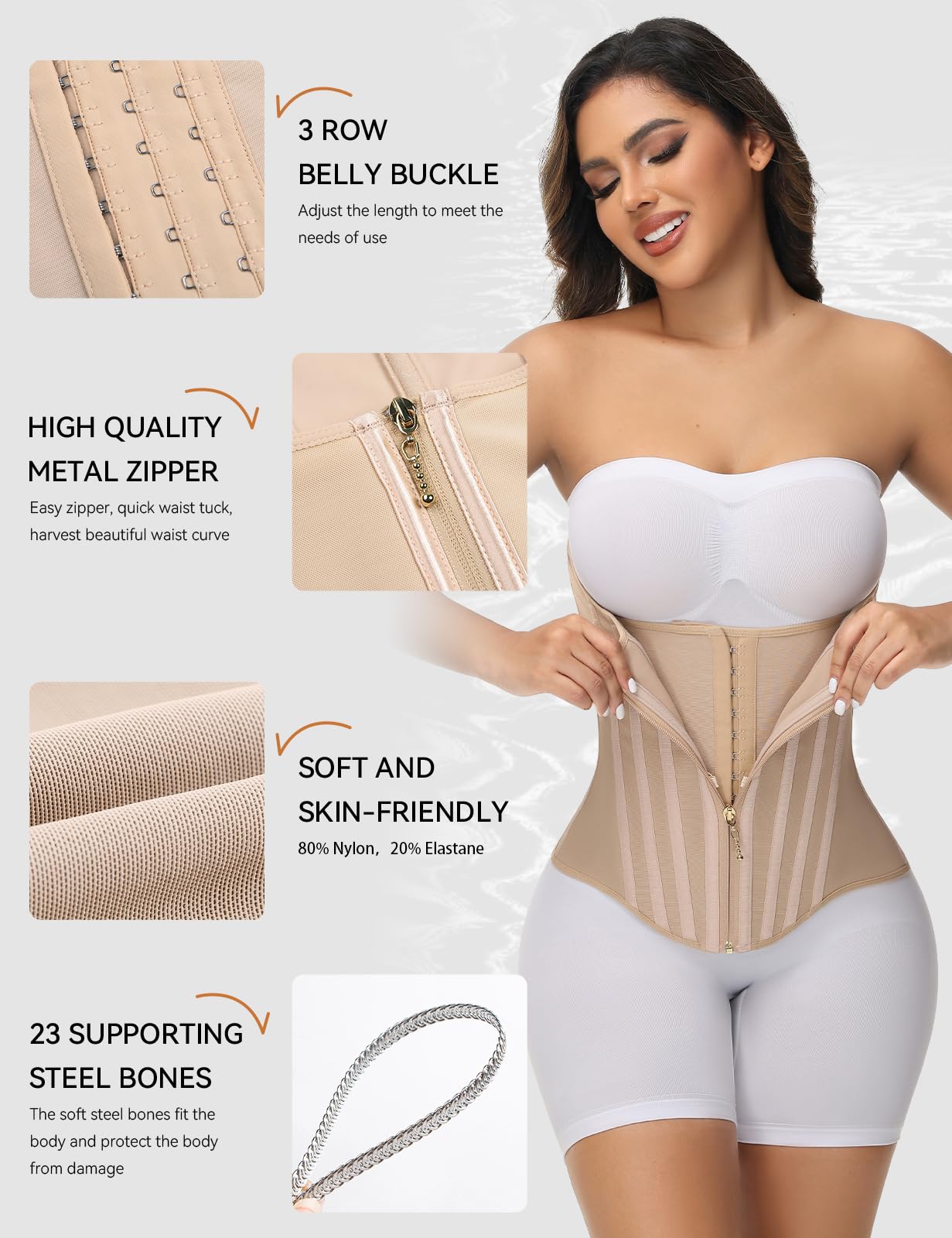 15 Steel Bones, Targeted Compression - Built with 23 flexible spiral steel bones and a shell-inspired design that wraps your waist evenly, providing full support while helping relieve back pressure and improve posture.